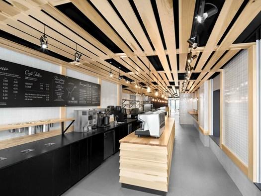 В проекте пекарни Au Pain Doré использовались доски из американского тюльпанного дерева для создания структурных элементов интерьера. Это позволило не только подчеркнуть современные линии, но и добавить тепла и уюта пространству.