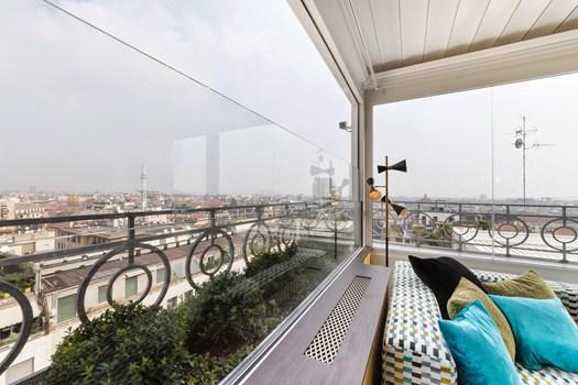 Система Bellavista Plus оснащена моторизованной раздвижной конструкцией, позволяющей закрывать большие проемы. Изготовлена из закаленного стекла и анодированного алюминия, устойчива к коррозии.