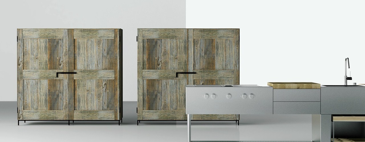 Open от Boffi изготовлена из нержавеющей стали и включает в себя уникальные элементы, такие как стеклянные полки и скрытые коммуникации.