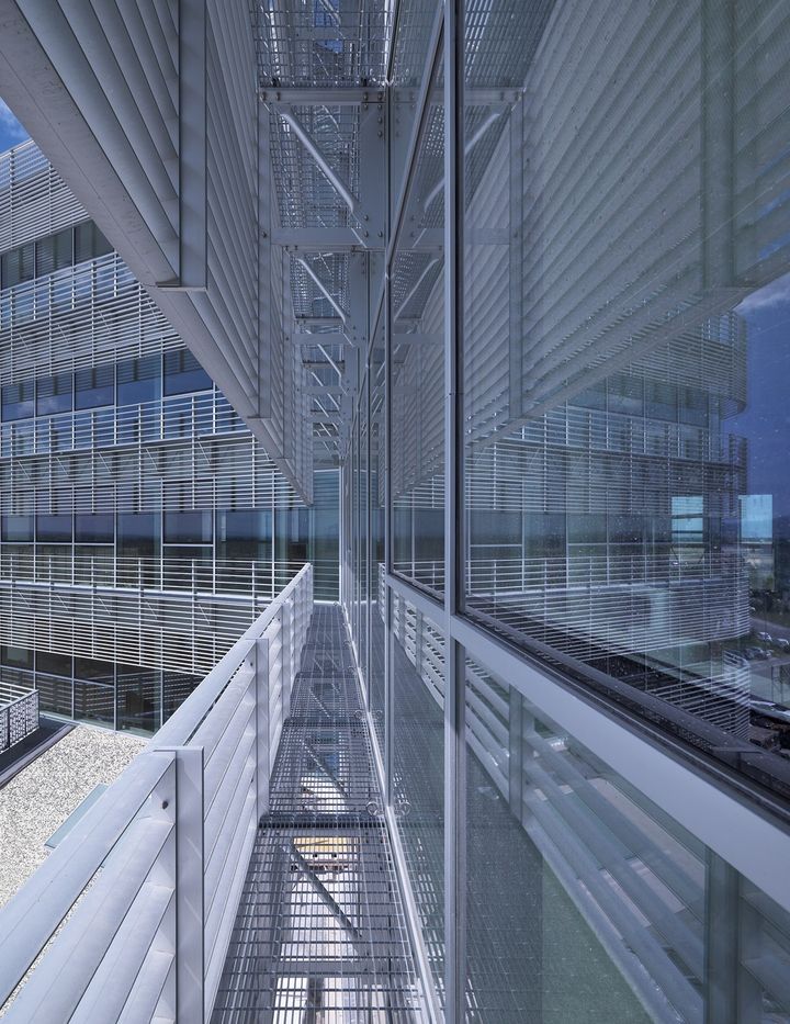 Использование алюминиевой системы Schüco FW 50+ для фасадов обеспечивает как эстетическую привлекательность, так и функциональность. Геотермальные системы и фотоэлектрические модули способствуют энергоэффективности здания.