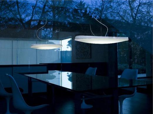 Светильник GURU состоит из двух элементов – верхней части из полиуретана и нижнего диффузора из плексигласа. Это обеспечивает равномерное рассеяние света. Он оснащен флуоресцентным источником света, что делает его экономичным и долговечным.