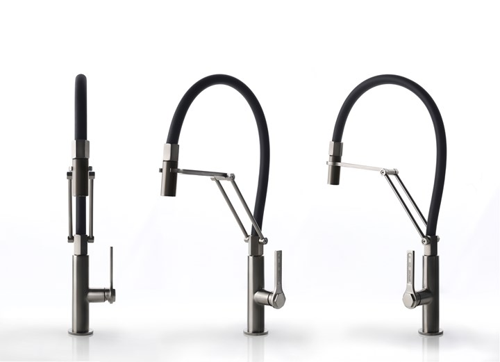 Коллекция включает в себя разнообразные модели, отличающиеся уникальными формами и текстурами. Например, смесители и краны с грубыми, 'необработанными' поверхностями, которые придают кухне индустриальный шарм.