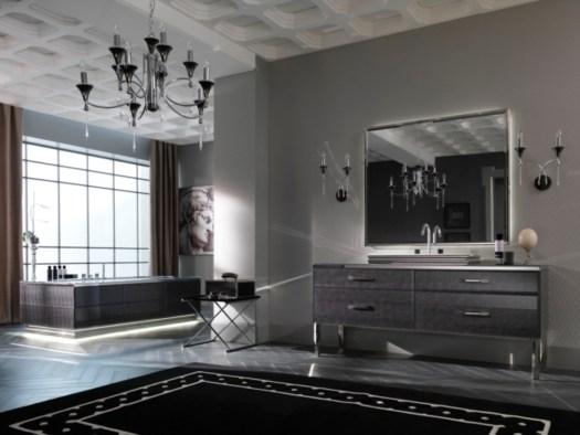 Коллекция включает хромированные и золотые ручки, уникальные зеркала и раковины, что подчеркивает её изысканность. Вариативность материалов — стекло, мрамор, оникс — позволяет адаптировать мебель под любые предпочтения.