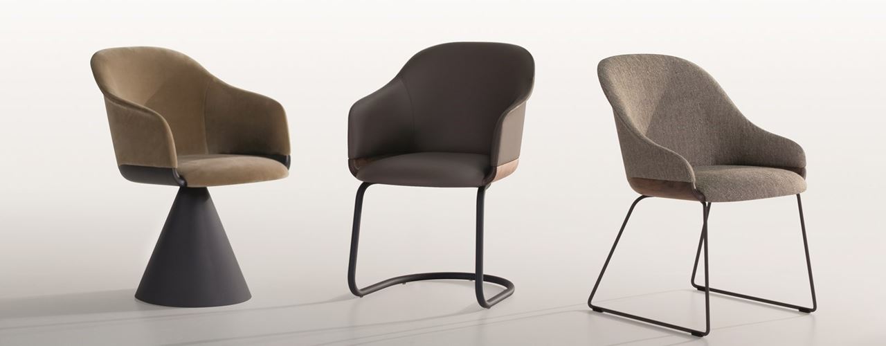 Коллекция LYZ предлагает стулья и кресла с решительными линиями и разнообразием материалов, от дерева до металла.