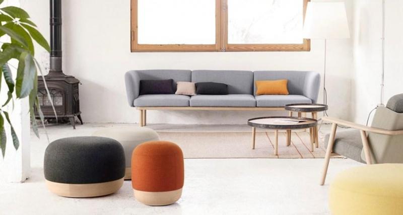 Коллекция включает диваны, столы и пуфы, подходящие для рабочих и жилых помещений.