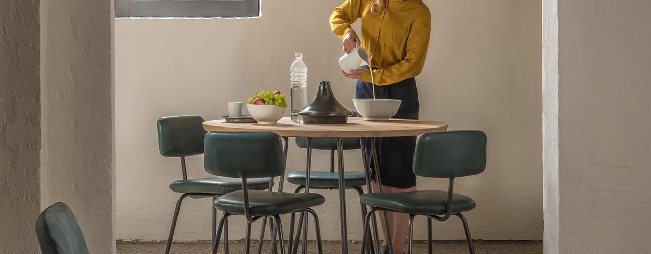 Jess предлагает мебель, сочетающую кожу и металл, включая кресла, обеденные и барные стулья.