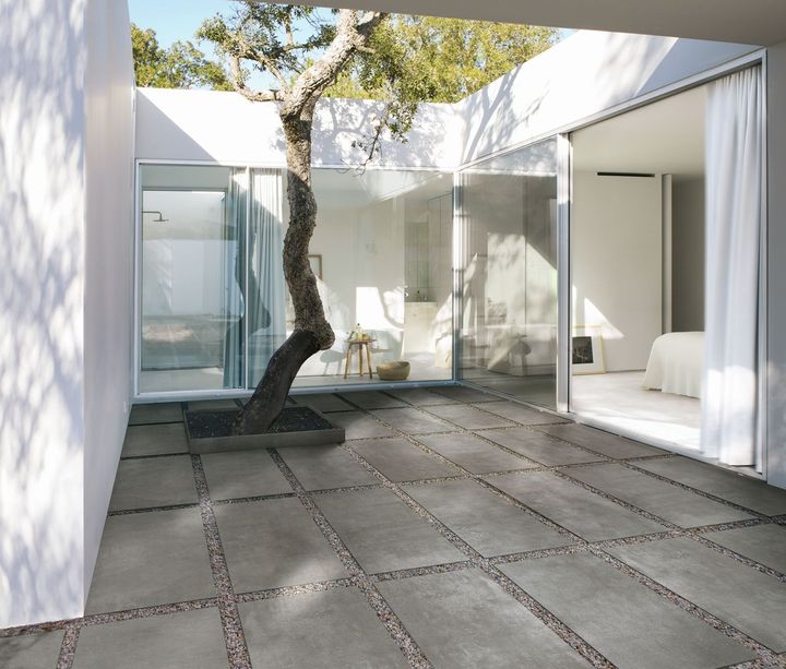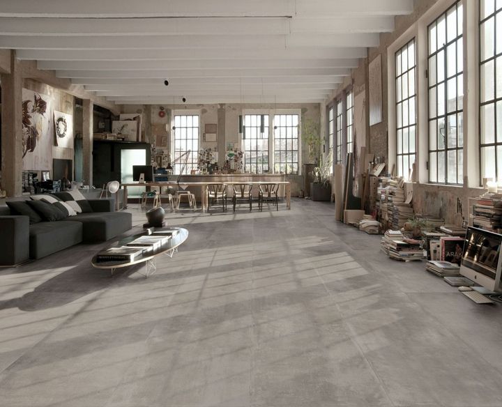 Керамогранит с эффектом бетона — идеальное решение для создания стильного интерьера. Он подходит для больших и небольших поверхностей.