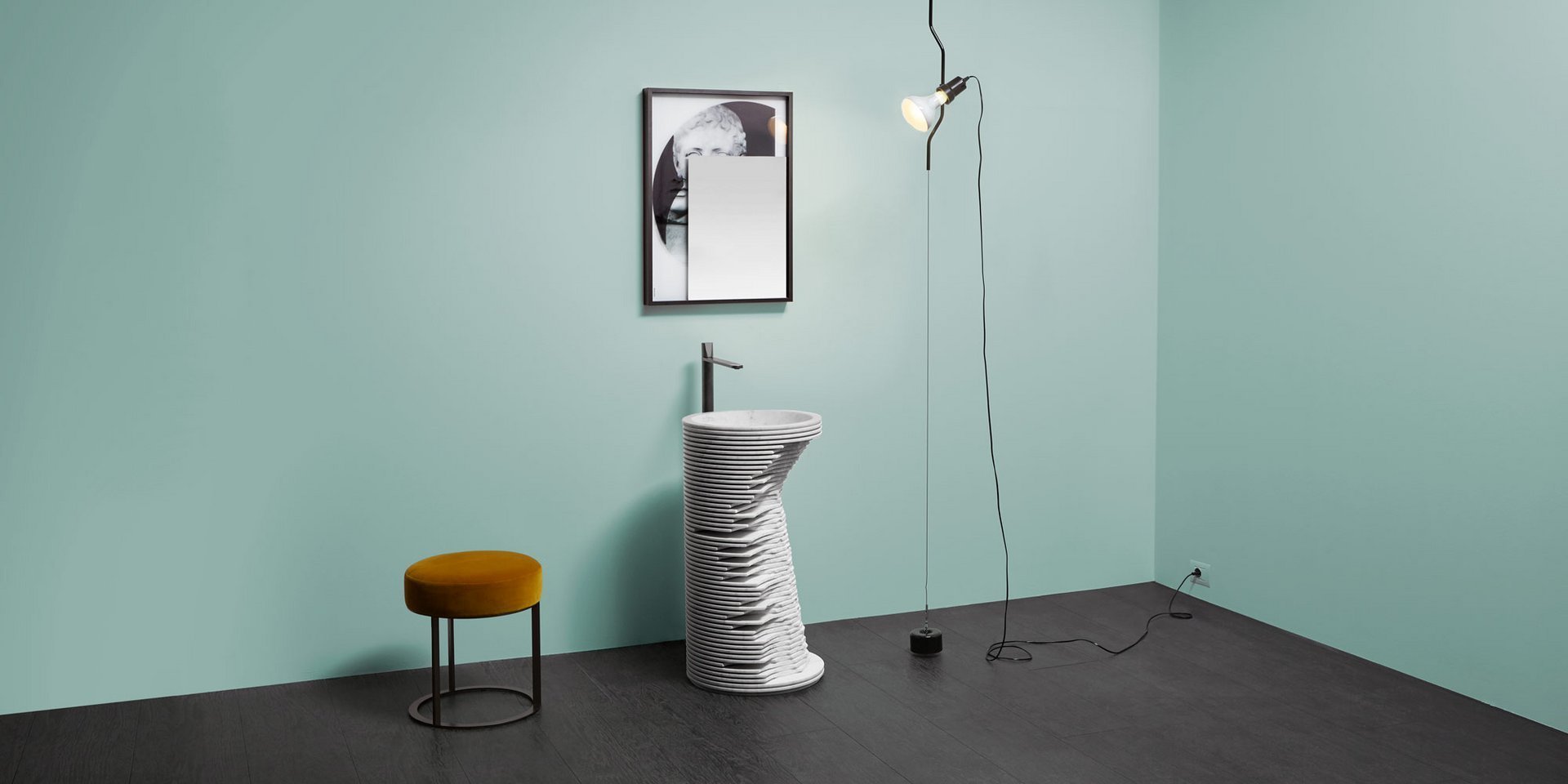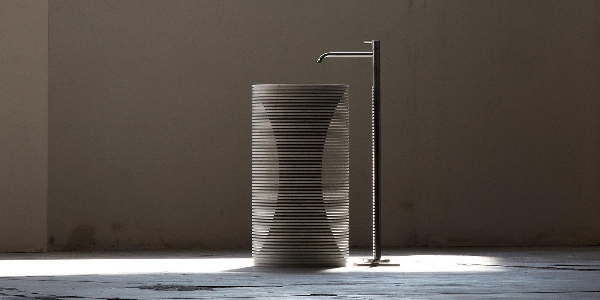 Идея этого умывальника родилась при наблюдении за грубой обработкой мраморных скульптур, в которой трехмерная форма скульптуры очерчена последовательными ступенями и на разной глубине алмазного диска, управляемого машиной с числовым программным управлением.