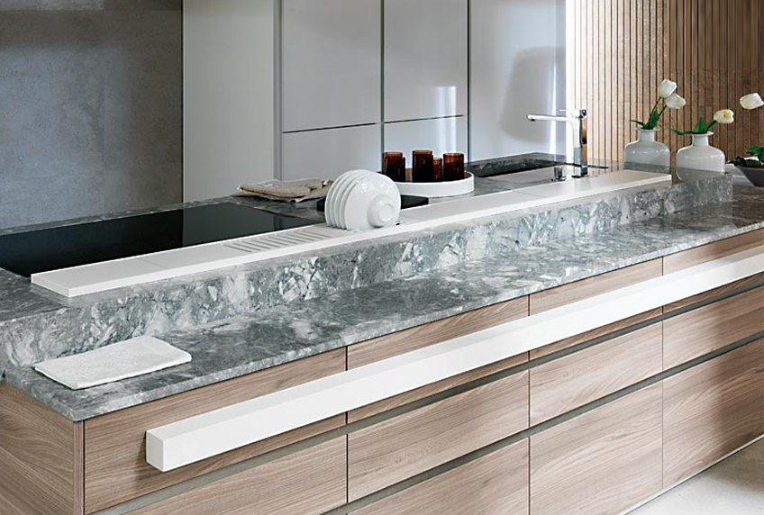 Встраиваемый кухонный канал из окрашенного алюминия серого цвета с дренажом.