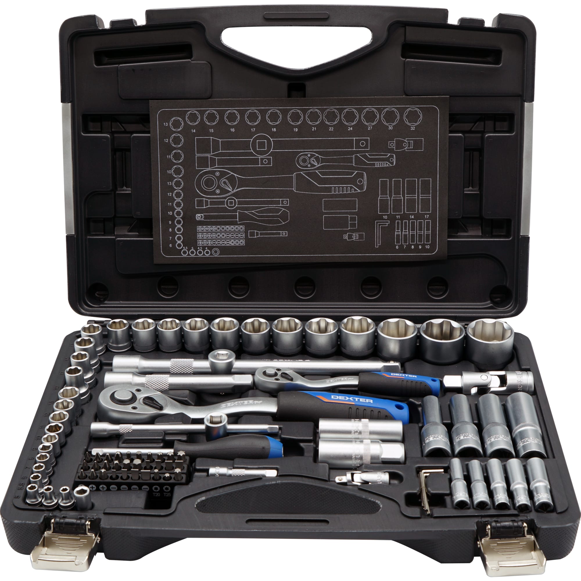 Набор головок Dexter предлагает комплексное решение для бытового и профессионального использования с 85 надежными элементами в удобном кейсе.