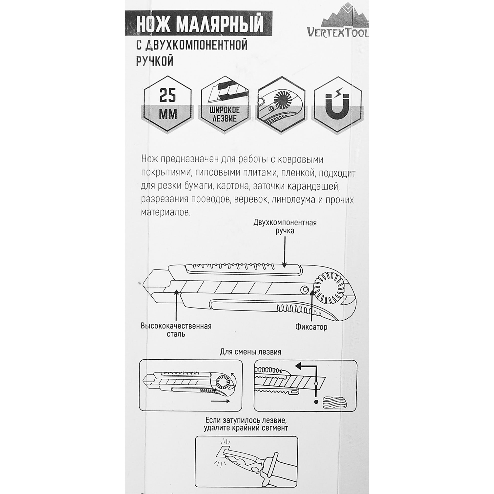 Строительный нож VERTEXTOOLS с противоскользящей рукояткой и сегментным лезвием 25 мм 84657016 STLM-0053273