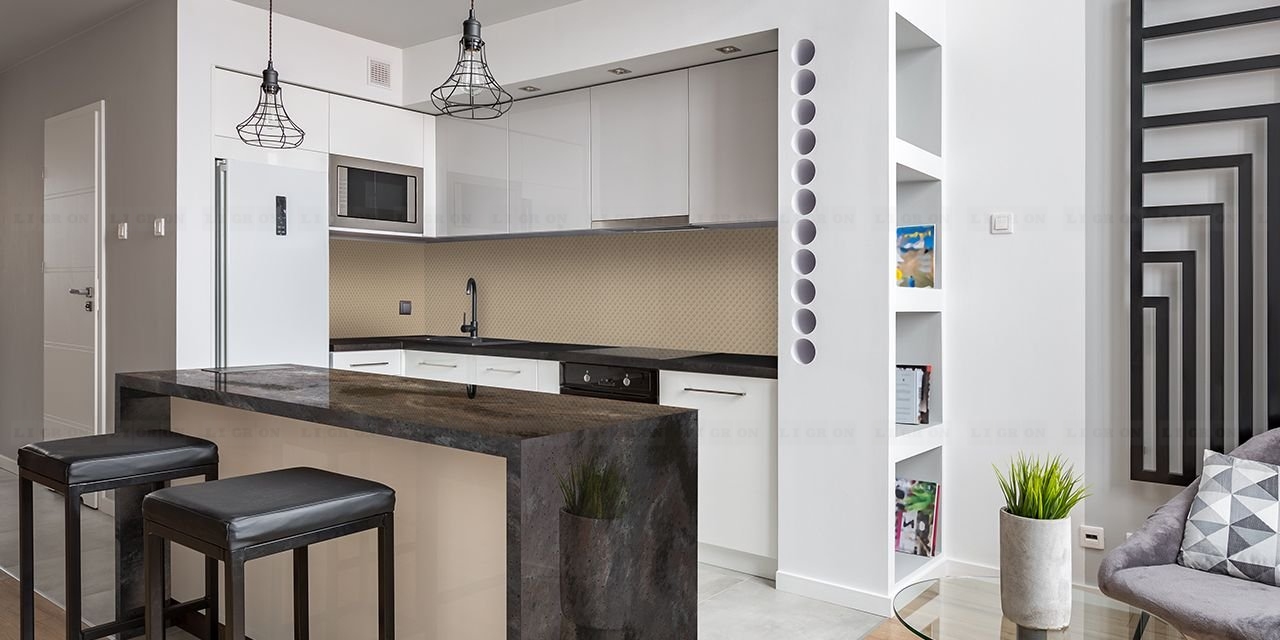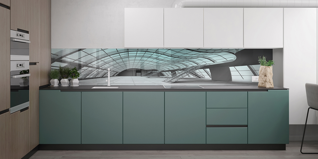 Стекло зеркалит, визуально увеличивая размеры помещения, расширяя пространство. Это ключевой момент в дизайне малогабаритных кухонь и дополнительный плюс в оформлении больших просторных помещений.