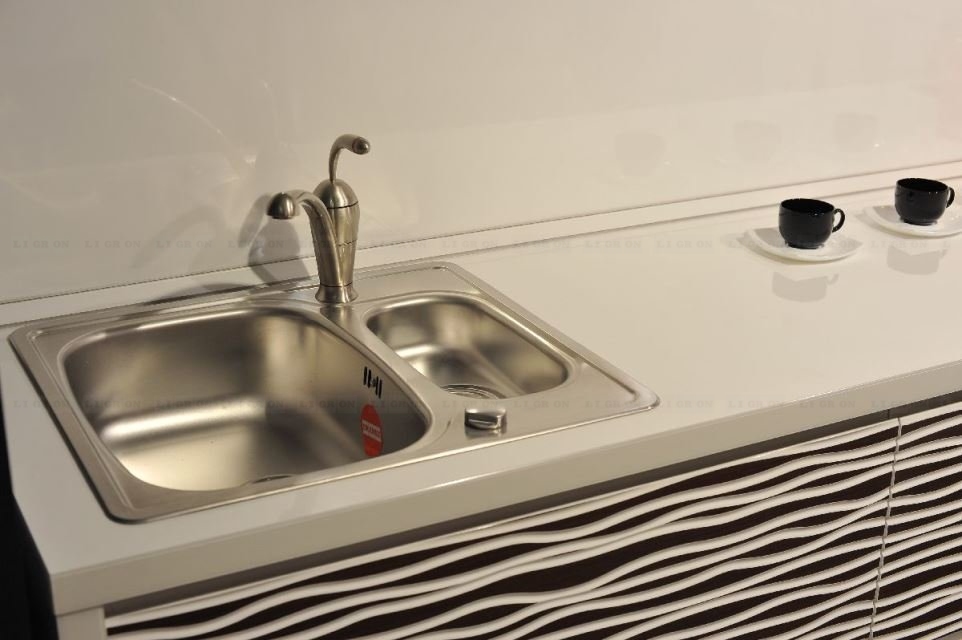 Предлагаются врезные мойки в один уровень со столешницей снизу (только компания Ligron врезает мойки в один уровень со столешницей из ламината снизу. Причем гарантия на все виды врезки моек – 5 лет). В один уровень со столешницей можно врезать разделочный элемент из кварца или керамики.