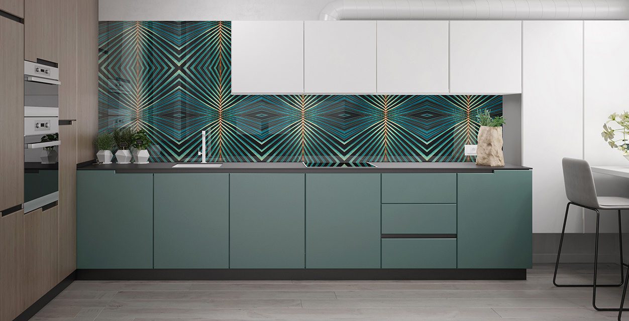 Стекло зеркалит, визуально увеличивая размеры помещения, расширяя пространство. Это ключевой момент в дизайне малогабаритных кухонь и дополнительный плюс в оформлении больших просторных помещений.