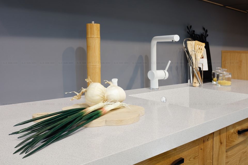 Поэтому имеются ограничения на изготовление столешниц с радиусами. Однако, LIGRON умеет обрабатывать кварцелан и изготавливать из него столешницы и стеновые панели с фигурными классическими профилями.