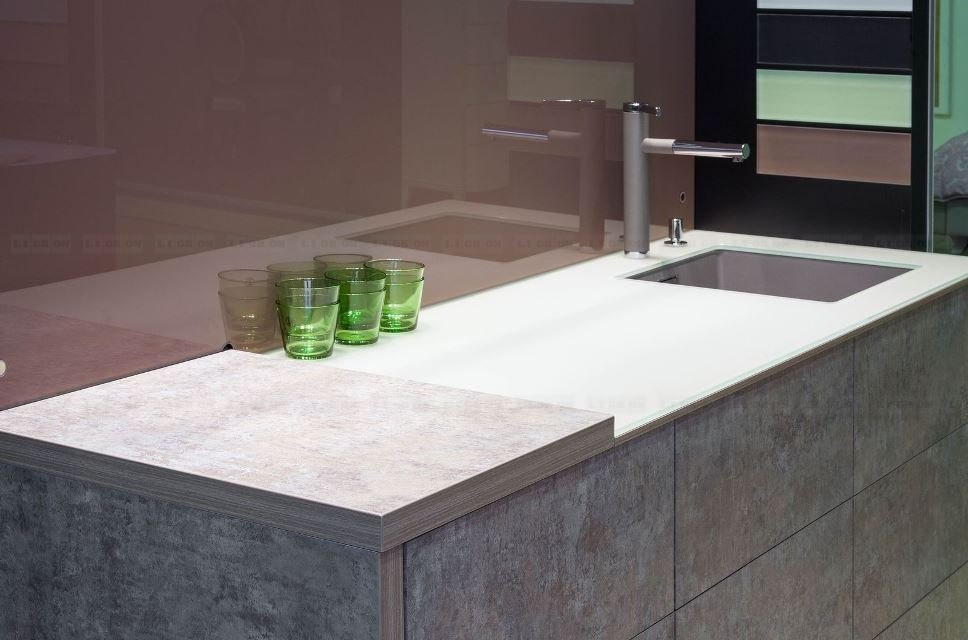 Предлагаются врезные мойки в один уровень со столешницей снизу (только компания Ligron врезает мойки в один уровень со столешницей из ламината снизу. Причем гарантия на все виды врезки моек – 5 лет). В один уровень со столешницей можно врезать разделочный элемент из кварца или керамики.