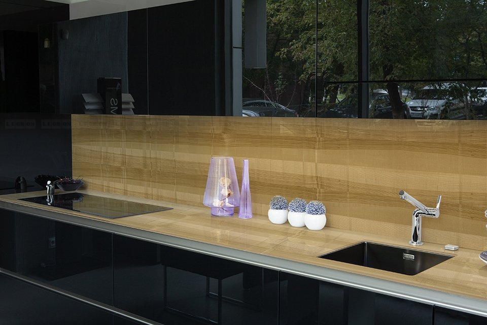 Возможность размещения в зонах сильного нагрева или непосредственно за газовой варочной поверхностью. Лучшая альтернатива неустойчивым к сильному нагреву материалам, таким как искусственный камень.