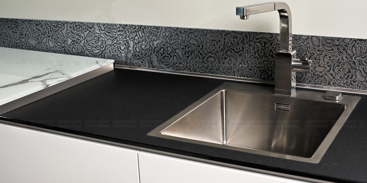 Quarzelan от Ligron — это кварцевый композитный материал, который на 95 % состоит из кристаллов натурального кварца. К кварцу добавляются высококачественные экологически чистые минеральные красители и полимерные смолы. Для получения более эксклюзивных и эффектных декоров добавляются мелкие кусочки стекла или зеркальные кристаллы. Впоследствии из данной смеси получаются плиты путём уплотнения методом вибрации под вакуумом. Таким образом Quarzelan сохраняет присущую кварцу твёрдость и своим видом полностью имитирует натуральный кварц, как внешне, так и на ощупь. При этом Quarzelan обладает исключительными свойствами, превосходящими все другие материалы, используемые для изготовления столешниц.Quarzelan очень устойчив против царапин и ударов, отталкивает грязь и бактерии, жароустойчив. В отличие от гранита и мрамора поверхность Quarzelan не пористая, поэтому различные химикаты и кислоты, фруктовые соки и вино не могут проникать внутрь и таким образом разрушать поверхность или вызывать изменение цвета. В повседневном применении поверхность Quarzelan не требует никакого специального ухода. Quarzelan - великолепный материал для изготовления кухонных столешниц и столешниц в ванные комнаты.