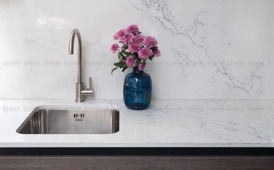 Обладает высокой теплостойкостью, стеновые панели можно размещать непосредственно за газовой варочной панелью. При этом ставить горячее на поверхность кварца нерекомендуется.