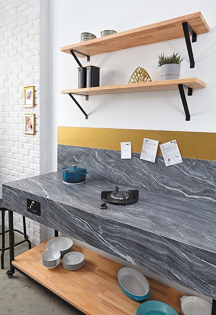 Столешницы Ceralan изготавливаются с подложкой из экструдированного пенополистирола. По длинным сторонам столешница имеет усиление в виде специального металлического профиля, который клеится вплотную к канту между подложкой и кантом столешницы.